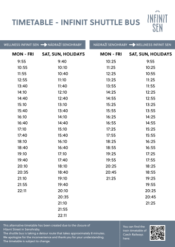 We would like to inform you that starting July 11, 2025 at 2:00 PM, there will be a change in the shuttle bus schedulebetween the Senohraby train station and Infinit Sen wellness.