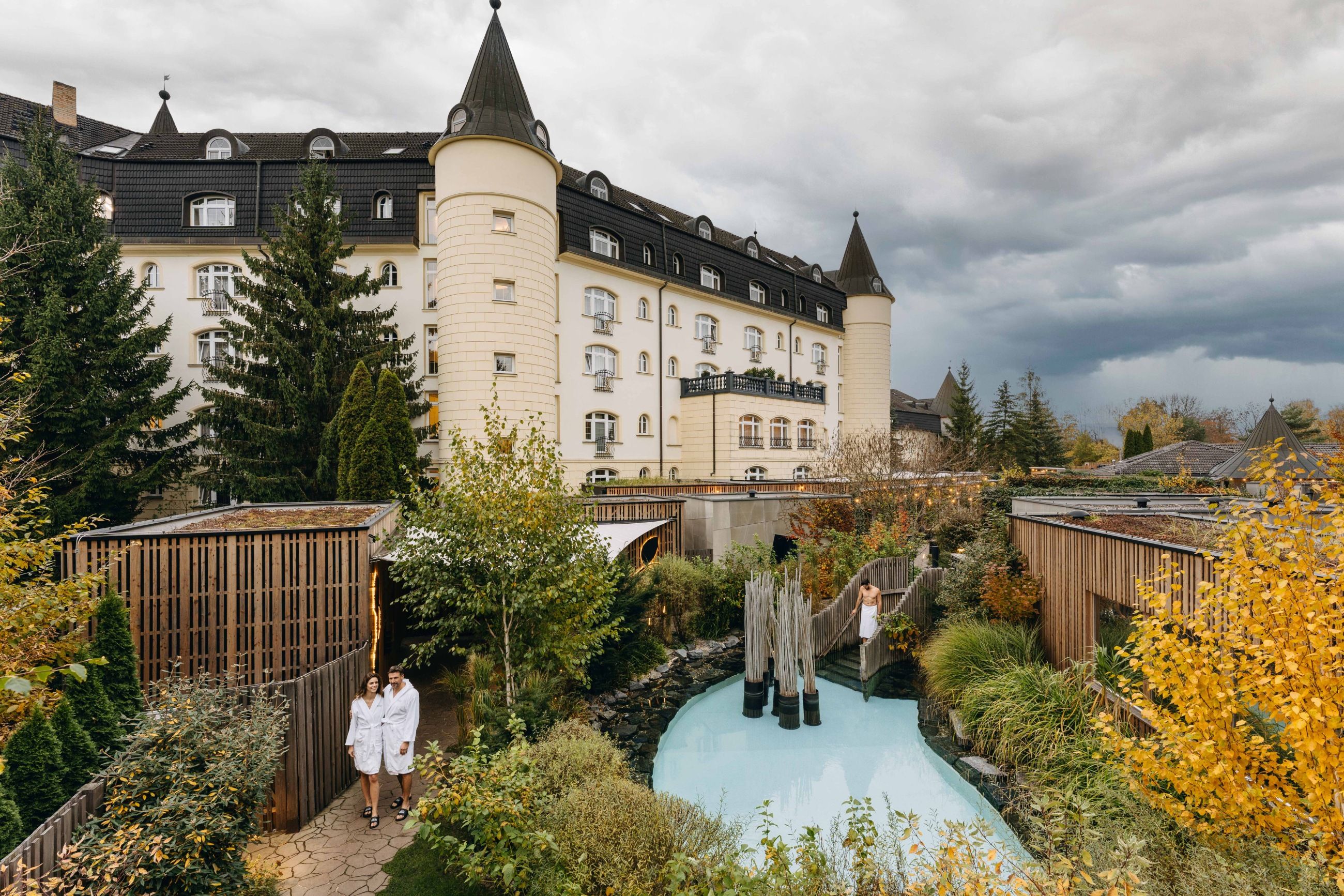 The panoramic dry sauna overlooking a small cooling pond draws you into the beauty of our magical garden full of saunas. Large-format light wood tiling and forest essence give the whole space elegance and pleasant aroma.