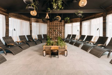 The bright relaxation room, dominated by a skylight, the ubiquitous hanging live plants and swinging loungers create a harmonious environment for relaxation. There is also a fresh bar and comfortable armchairs, which directly invites you to relax between sauna cycles. Water service is available at the fresh bar.