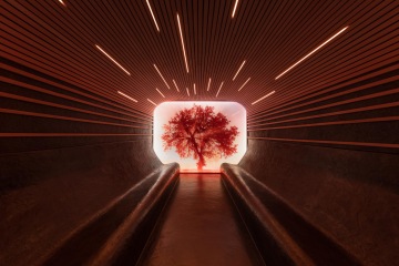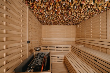 Suspended wooden veneers dominate the area of the orchard sauna. With their movement and play of light and shadow, they resemble fruits and petals on a tree. The sauna has higher humidity, and its intertwined walls together with fruit essences bring you under the orchard trees from Josef Lada's fairy tales.