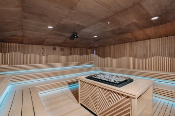 The salt sauna offers a combination of dry sauna and unique properties of salt. Illuminated strips on the walls made of Himalayan salt bricks and a pleasant warm glow have calming effect on the human psyche. When staying in a salt sauna we also absorb minerals that have a very beneficial effect on the human body, especially on the airways, skin and concentration.