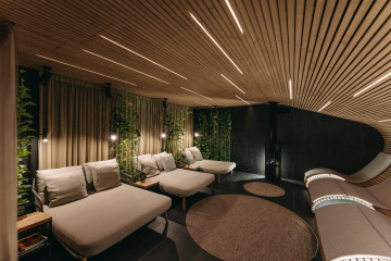 Complete peace and quiet is offered by the Dark Relaxation with comfortable loungers, softly dimmed lighting and a soothing view of a blazing fireplace. The space is designed to promote deep relaxation of body and mind and allow you to fully immerse yourself in silence. The Dark Relaxation is ideal for those looking for a real slowdown, undisturbed rest or a moment to themselves between sauna cycles.