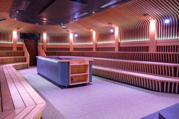 The most modern ceremonial sauna, which hides a unique sound system, high-quality lighting, audio-visual elements and a small stage for sauna masters. In addition to standard ceremonies, sauna events (nights, competitions) are also organized in the sauna. The humidity and temperature in the room may vary depending on the ceremonies being performed. The capacity of the ceremonial sauna is up to 150 people.