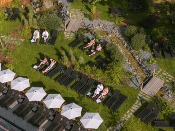 Outdoor relaxation zones combine the peace of nature with the comfort of relaxation. For moments in the sun and shade, there are sun loungers by the pool and in the garden, shade is provided by spread-out parasols and mature trees. There are also practical tables for placing drinks or books, and all you have to do is sit back and relax.