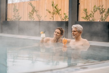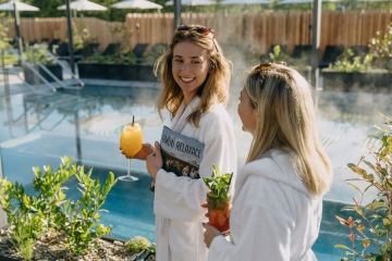 Uvolněte se v termálním bazénu s vaším oblíbeným nápojem pod širým nebem a odhoďte starosti všedních dnů za hlavu.