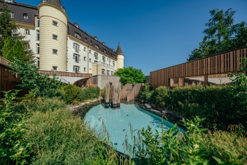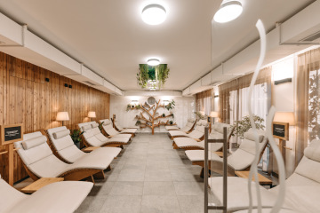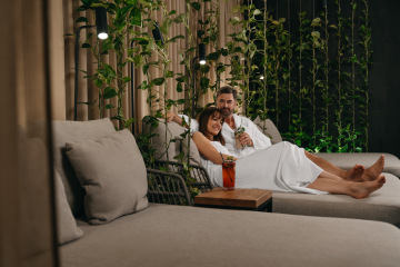 Vedle bazénu se nachází prostorná panoramatická odpočívárna s pohodlnými lehátky, ze kterých si můžete vychutnat výhled na novou ceremoniální saunu. Atmosféru doplňují všudypřítomné rostliny, svícny a příjemná vůně.